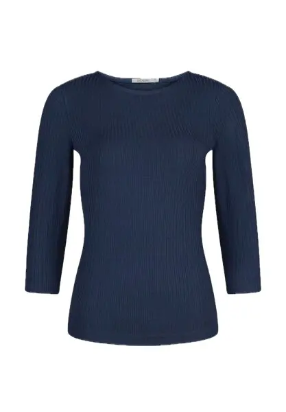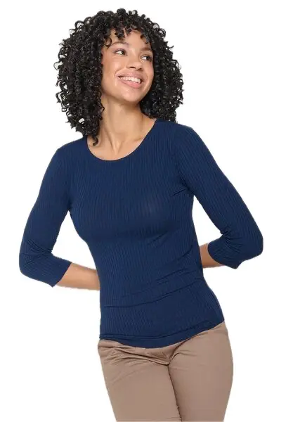 Mit seinem Rippstrick-Design, den ¾-Ärmeln und der femininen Silhouette ist es ein vielseitiges Essential für jeden Tag. Ob solo getragen oder unter einer Strickjacke kombiniert – dieses Shirt ist ein echter Allrounder für deine nachhaltige Garderobe.